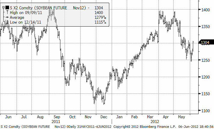 Priset på sojabönor föll tillbaka i slutet på förra veckan till följd av sämre än väntade exportsiffror och fallande priser i råolja, men vände sedan återigen uppåt i början av denna vecka , dels efter en bekräftad försäljning av sojabönor till Kina samt att USDA’s rapport i måndags visade en något sämre crop condition för sojabönor än väntat (65% good/excellent mot 70% förväntat).