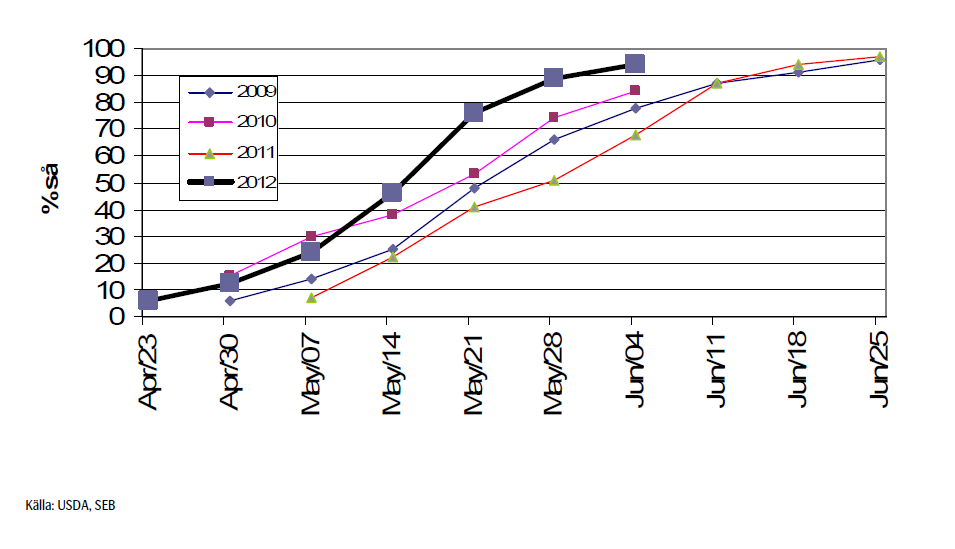 Sådden går fort framåt i USA är nu avklarad till 94% jämfört med förra veckans 89%. I södra USA har man skördat klart höstvetet och kan så en andra skörd av sojabönor.