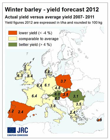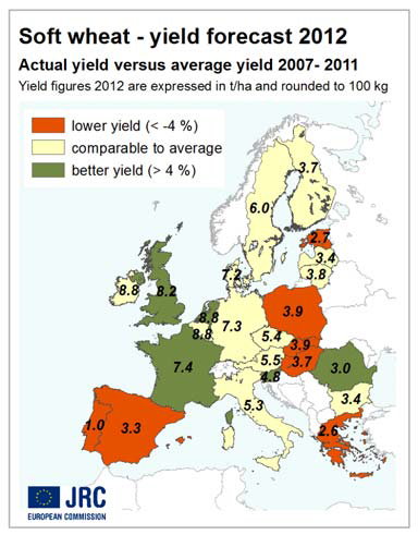 Prognosen för vete produktionen inom EU-27 har reviderats ned med 200 000 ton sedan förra rapporten till 126.5 mt, främst på grund av lägre förväntad avkastning i Tyskland, Bulgarien och Rumänien. Dock har avkastningsprognosen för Frankrike och Storbritannien justerats upp något och den genomsnittliga avkastningen för dessa länder beräknas uppgå till 7.19 ton per hektar respektive 8.18 ton per hektar.