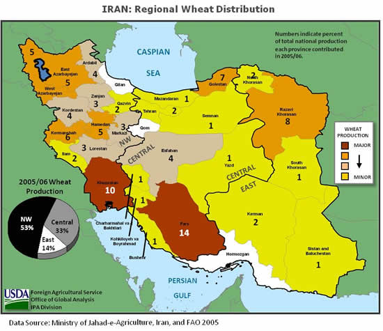Dessvärre är utsikterna för landets veteproduktion 2012 något nedslående. Generellt sett så har Iran haft en måttligt positiv växtsäsong i år, men de regionala förhållandena har varit ganska varierande. Veteproduktionen beräknas bli marginellt högre än förra året, men en fördubbling av importen förväntas för att möta den inhemska efterfrågan och för att bygga upp tömda lager. USDA’s uppskattning av produktionen per den 10 maj 2012 ligger på 14 mt, en ökning med 4 procent från förra året. Avkastningen beräknas till 2,0 ton per hektar, vilket är något över det 5-åriga genomsnittet.
