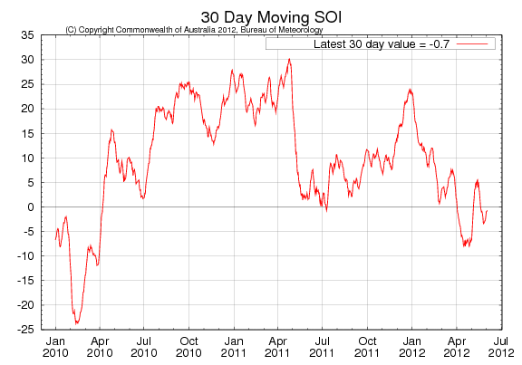 Southern Oscillation Index, ett mått på intensiteten i graden av La Niña eller El Niño, håller sig på den negativa sidan av neutral och ligger nu på -0.7. Ett värde mellan +8 och -8 indikerar neutrala ENSOförhållanden.