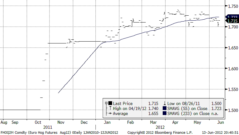 Nedan ser vi augustikontraktet på hogs på Eurex. Det är 78 kontrakt öppen balans, dvs det är totalt 78 köpta och sålda kontrakt som clearas av Eurex. Jämfört med för ett år sedan är öppen balans högre och stabilare. Marknaden har av allt att döma fått ett visst förtroende i branschen. Det är naturligtvis långt att gå innan likviditeten är så hög som på CME, men så här långt ser det bra ut.