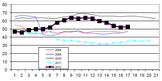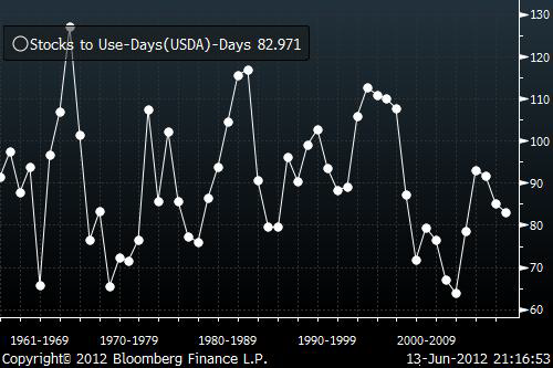 Nedan ser vi ett diagram på utgående lager, uttryckt som antal dagars konsumtion. Vi ser att globala utgående lager är på en relativt låg nivå, och alltså inte väntas stiga 2012/13. Det innebär att potentialen för radikalt lägre priser är begränsad. Det innebär också att priserna kommer att vara svängiga då konsumenter är lite extra oroliga.