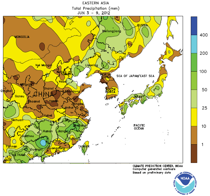 Vetearealen och produktionen i Kina 2012/13 förväntas bli oförändrad. I provinserna Henan, Hebei, Anhui, Shandong och Jiangsu, som är de stora producenterna av höstvete, börjar skörden i juni (vissa sydliga provinser har redan startat). Även om torka har rapporterats i Hebei-provinsen, är det dock fortfarande för tidigt att säga om detta kommer att påverka produktionen.