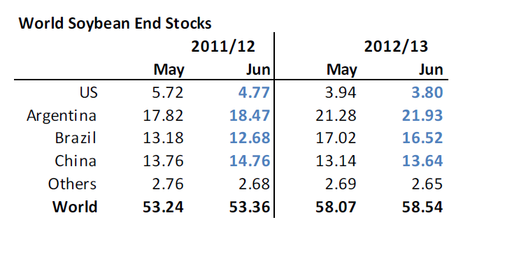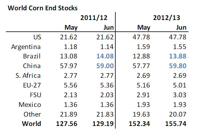 Nedan ser vi USDAs estimat för utgående majslager. Dessa väntas öka 2012/13, med drygt 3 mt. Detta innebar att marknaden tog rapporten negativt.