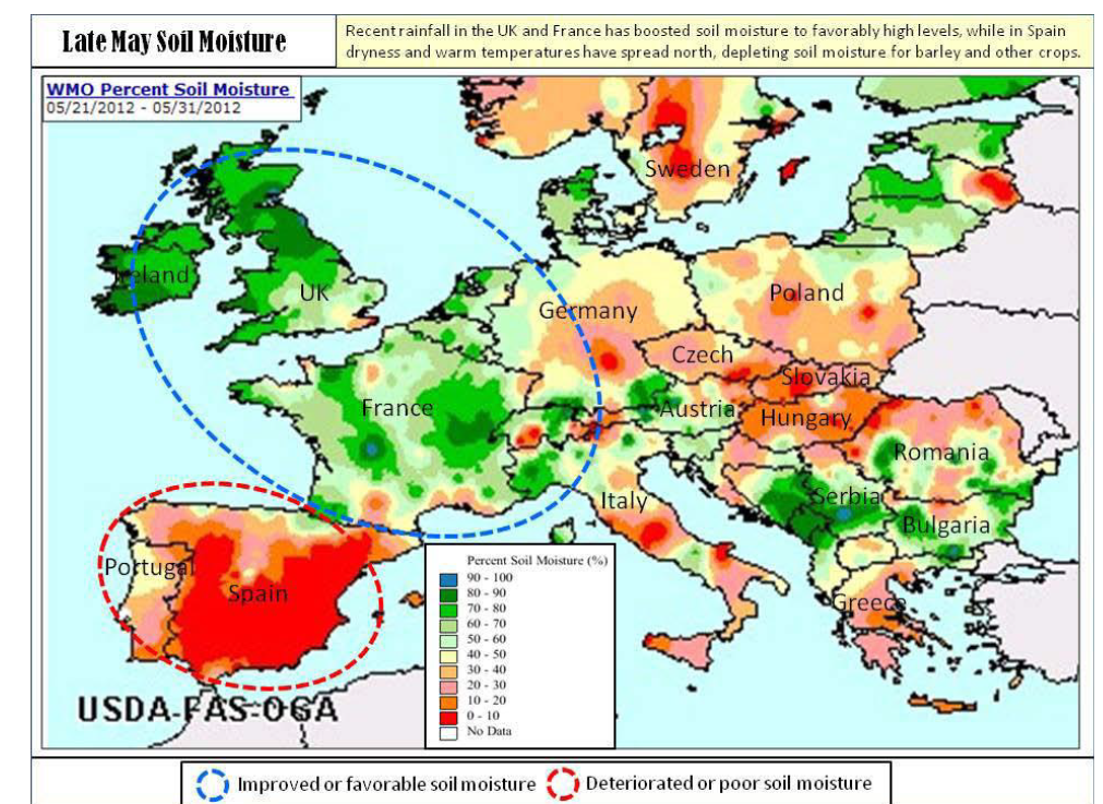 Prognoserna för Rysslands spannmålsskörd 2012 varierar från ett lägsta om 88 mt från vissa branschanalytiker till så högt som 93-94 mt av det ryska jordbruksministeriet. FAS estimerar produktionen till 88 mt, en nedgång från 94 mt förra året, som en följd av dåliga förhållanden för övervintring i de viktiga södra produktionsområdena samt torrt och varmt vårväder i Volga området och i de centrala delarna. I många delar var höstgrödorna i mycket gott skick i mars och början av april, men sedan dess har förväntningarna på avkastning sänkts på grund av en drastisk och oväntad minsknings av markfuktighet. Många lantbrukare har klagat över att det praktiskt taget inte blev någon vår, då den kalla vintern plötsligt byttes ut mot sommarvärme och torka, vilket resulterade i att de varma temperaturerna snabbt smälte snön som snarare avdunstade istället för att tillföra jorden behövlig fukt.