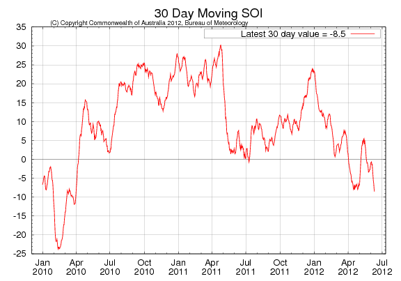 Southern Oscillation Index, ett mått på intensiteten i graden av La Niña eller El Niño, sjunkit lägre. Aktuell notering är -8.5. Ett värde lägre än -8 innebär El Niño. El Niño är bra för globalt odlingsväder.