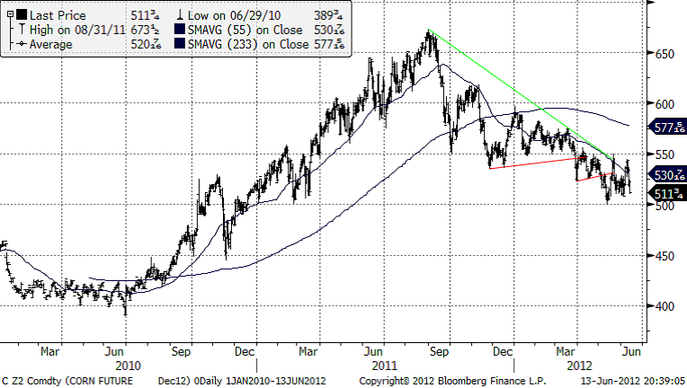 Priset på decembermajs fortsätter i sin negativa trend, som marknaden haft sedan september förra året. Vi tror att majspriset kommer att bryta 500 cent och fortsätta ner. 500 cent är en psykologiskt viktig nivå, inte minst för att det är en så jämn siffra. Jämna siffror brukar attrahera köpordrar av folk som inte tänker längre än så.
