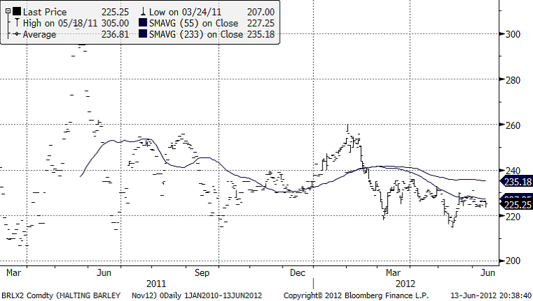 Novemberkontraktet på maltkorn har fortsatt att handlas sidledes, något svagt. 220 euro tycks vara ett psykologiskt stöd för marknaden.