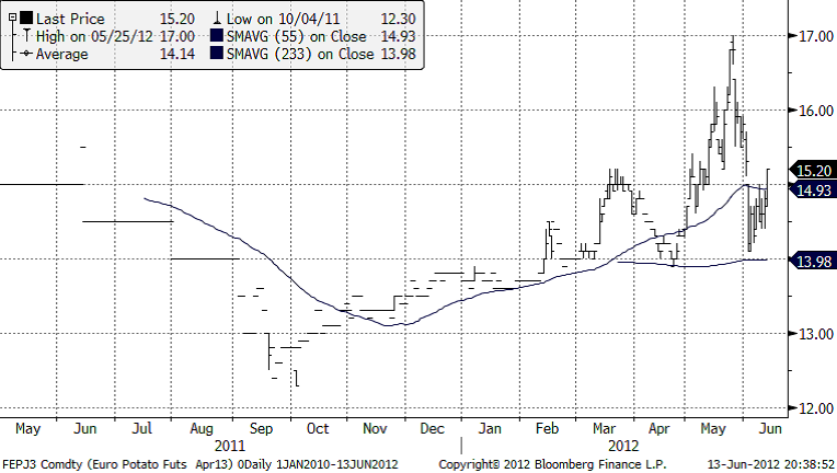 Potatispriset för leverans nästa år, som i slutet av maj var uppe på 17 euro per deciton och sedan såldes ner till 14, har återigen vänt uppåt. Trenden är alltjämt uppåtriktad och vi fortsätter att ha en positiv syn på potatispriset för ny skörd.