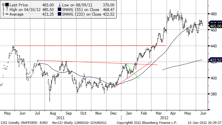 Priset på novemberterminen befinner sig fortfarande i rekyl efter vårens kraftiga prisuppgång. Det är större brist på raps än på sojabönor och rapsen är mindre beroende av Kinas efterfrågan.