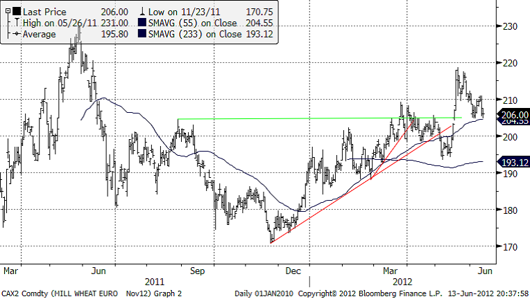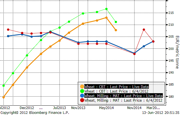 Nedan ser vi hur terminspriserna på Matif och Chicago förändrats den senaste veckan. Matif är oförändrad. Chicago har fallit över alla terminslöptider. Vi är hellre säljare av Matif än av Chicago, i synnerhet vad gäller december 2012, där Chicago ligger på lite drygt 190 euro per ton. Möjligen kan man våga sig på att köpa Chicago december och sälja Matif november i förhoppning om att priserna ska konvergera.