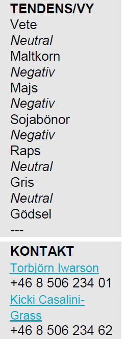Det verkar också som om det kommer att införas en omsättningsskatt på terminsaffärer inom EU, vilket ökar transaktionskostnaden för att prissäkra jordbruksprodukter. Sverige och Storbritannien har hittills varit ovilliga att gå med på detta, som naturligtvis gör det dyrare att prissäkra bort prisrisk för jordbrukssektorn.