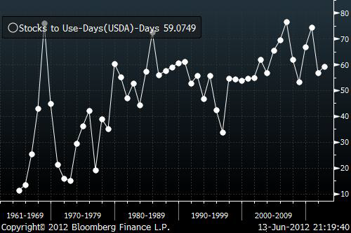 Lagren av majs har länge varit låga, men nu väntas alltså högre utgående lager, som ser i nedanstående diagram. Diagrammet visar utgående lager i termer av dagar av konsumtion sedan 1961. Efterfrågan från Kina och andra tillväxtländer och efterfrågan på råvara till etanoltillverkning har hållit lagren pressade. När det gäller etanol är ökningen i efterfrågan med största sannolikhet över. I USA har man nått upp till 10% inblandning och högre går inte att gå utan skador på motorerna. Naturgas har blivit ett extremt billigt bränsle i USA och kommer troligtvis att ta marknadsandelar både på bensinens och därmed också etanolens bekostnad.