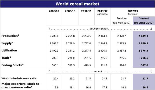 Den totala spannmålsproduktionen i världen 2012 beräknas nu uppgå till rekordhöga 2 419 mt efter att FN:s livsmedels- och jordbruksorganisation (FAO) höjer sin prognos för produktionen med 48,5 miljoner, vilket är 3,2 procent upp jämfört med 2011. Ökningen beror främst på en förväntad rekordskörd av majs i USA.