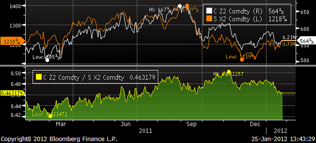 Vi ser i nedanstående diagram som visar kvoten mellan majs- och sojapris att majsen tappat i pris i förhållande till sojabönor, men det finns ingen direkt brist av sojabönor i världen.