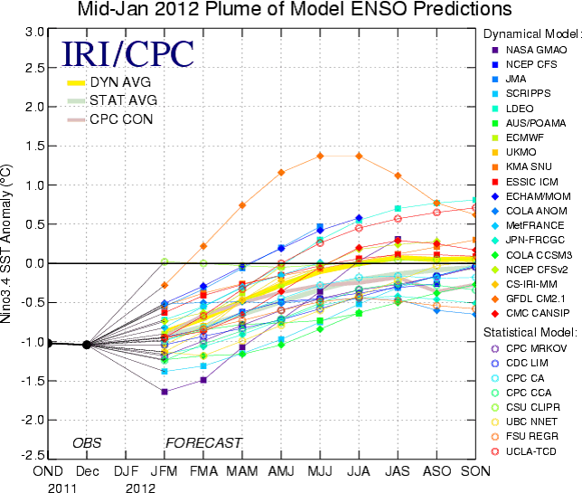 Det finns en rad modeller för att göra prognoser på framtida ENSO-förhållanden. Nedan ser vi en ”plym” av sådana prognoser framåt i tiden. Vi ser att La Niña väntas hålla i sig fram till hösten. Då ska vi kanske också notera att tillförlitligheten på ENSO-prognoser sträcker sig ungefär 6 månader framåt i tiden. Det finns alltså risker för La Niña-orsakad torka under sommaren.
