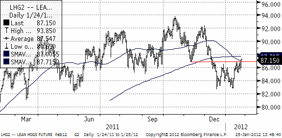 Priset på lean hogs är uppe i sälj-zonen igen. Med så många typer av tekniska motstånd ansamlade vid och strax ovanför där priset ligger idag, är sannolikheten låg att priset tar sig rakt igenom. Vi rekommenderar att man säljer vid den här nivån. Statistik från Kina visar att grispopulationen sjönk i december för första gången på 10 månader. Samtidigt rapporteras som utbrott av African Swine Fever (ASF) på flera håll i världen, bland annat i olika regioner samtidigt i Ryssland.