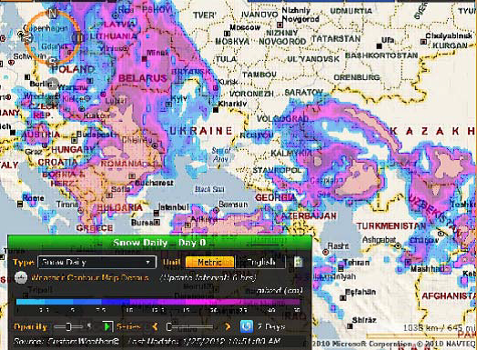 Det har snöat kraftigt i delar av Ryssland, men det finns motstridiga uppgifter om huruvida snön fallit på jordbruksmark eller inte. Det förefaller som om det gjort det, till viss, men ganska liten del. Nedan ser vi en radarbild på snöfall över södra Ryssland och att snön missat viktiga regioner som Voronetz och Tambov.