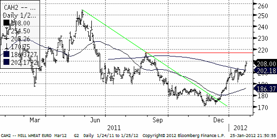 Nedan ser vi kursdiagrammet för marskontraktet på Matif, som verkligen brutit uppåt. Nästa motstånd ligger på 217 euro, men under gårdagen fanns det gott om säljare på 210 euro, som blev toppen på dagens handel.