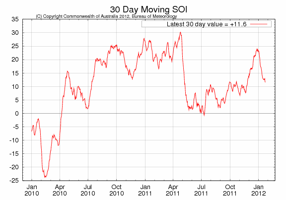 Det råder väl inget tvivel om att det är La Niña-fenomenet som står i centrum för skörden i Argentina och södra Brasilien. Fenomenet påverkar också vädret i Nordamerika. Det är därför det är extra torrt där också. Som vi har berättat tidigare har fenomenet nått sin kritiska nivå vid årsskiftet och har fortsatt att försvagas de senaste två veckorna. I diagrammet nedan ser vi utvecklingen av Southern Oscillation Index (”SOI”) på daglig basis. Ett värde >8 innebär att det råder La Niña.
