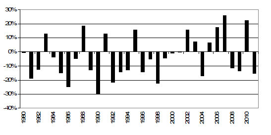 Vi har gjort en studie av hur vetepriset (Chicago) förändras mellan den sista december och den sista juli varje år. Vi ser en bild på dessa prisförändringar i procent nedan.