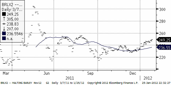 Argentinska La Nacion rapporterar om landet har fått den högsta maltkornsskörden på 10 år. Skörden uppgår till 3.65 miljoner ton och arealen för maltkornsproduktion har ökat med nästan 50% jämfört med 2010/11. En av de viktigaste orsakerna till denna ökning är att producenterna försöker hitta ett alternativ till vete och en tidig maltkornsskörd ger också möjligheten att så sojabönor efteråt.