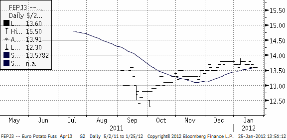 Priset på potatis har fortsatt att försvagas och när nu nära att bryta 55-dagars glidande medelvärde, vilket vore en negativ teknisk signal.