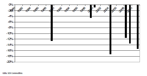 Genomsnittet är en prisnedgång på 4% (en mycket stor anledning att sälja terminer på vintern, för övrigt). Om vi sedan väljer ut de ”vårar” när det varit La Niña-förhållanden vid årsskiftet, hur har det gått då? Det visar sig att man då får enbart får fram vårar med prisnedgångar, som vi ser i diagrammet nedan.