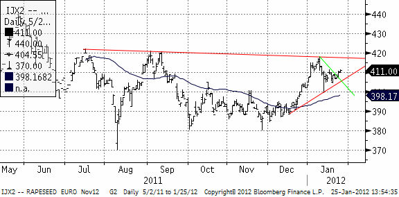 Höstens torra väder i Ukraina kommer också att påverka årets rapsskörd och man räknar med att produktionen kommer att falla 19% till 1.13 miljoner ton vilket skulle vara den lägsta på 5 år enligt data från USDA. EU´s importbehov av raps förväntas bli mycket hög. Den globala produktionen av raps och canola uppskattas uppgå till totalt 61.5 miljoner ton 2012/13, en ökning med 3.4% och den första ökningen på 3 år. Utifrån väderproblemen i Ukraina, en betydligt mindre sådd av höstraps i EU och sjunkande lager, så kommer det att krävas ytterligare ökning av den kanadensiska canola produktionen för att möta efterfrågan under 2012.