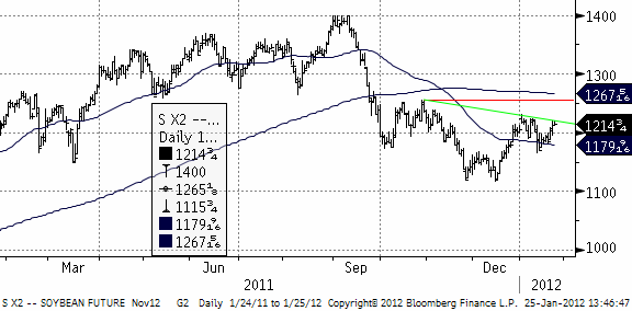 Om regnen kommer till Argentina som väntat vid månadsskiftet bör hektarskörden kunna stabiliseras. Det är snarare majsmarknaden som är svag än sojamarknaden som är stark. Det finns gott om tekniska motstånd på ovansidan och det är knappast troligt att en ny bullmarknad skulle orka ta sig rakt igenom dem.
