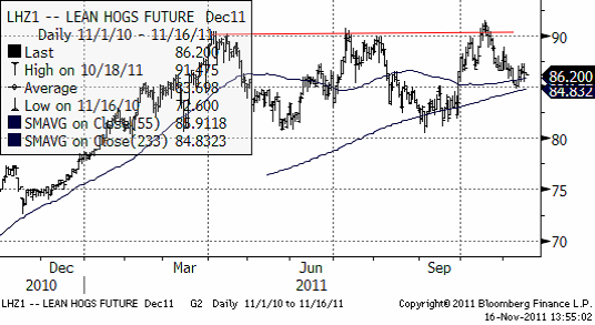 Tekniskt vilar priset på lean hogs på de glidande medelvärdena, vilket kan ge visst stöd. Test av dessa ger viktig information om rörelsen på kort sikt. Det falska brottet uppåt i oktober, ger en stark varning om att ”bulls” håller på att förlora kriget. Det är ganska vanligt att marknaden faller av kraftigt efter att den visat en falsk köpsignal. Ytterligare säljasignal ges när de glidande medelvärdena bryts. Just nu ger de glidande medelvärdena stöd. Nedan ser vi decemberkontraktet på CME, där priset fortsatt har varit i rekyl från den falska köpsignalen för två veckor sedan.
