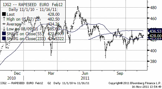 Rapspriset håller sig högt pga den svaga euron, inget annat. Raps är dyrt i förhållande till sojabönor och ”borde” falla ner mot 400 euro i första hand.