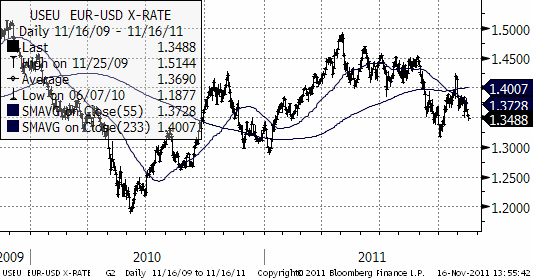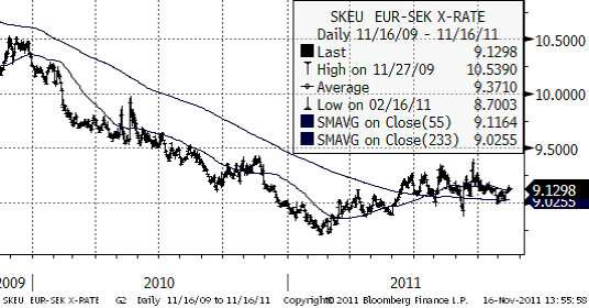 Detta om inte ECB tillåts genomföra en europeiska version av det amerikanska QE2 – dvs att trycka pengar och pumpa in dem i ekonomin. I vilket, fall borde euron falla mot dollarn. Men väljer man inflationsvägen för att bli av med de ohanterligt stora statsskulderna får man en boom i råvarupriser och markpriser. Till den punkten är det nog ändå en tid kvar. Till dess blir det nog en orolig färd.