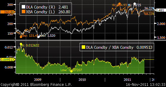 Etanol borde kosta 70% av bensin, eftersom etanol har ett energivärde som ligger på 70% av bensinens, men i diagrammet nedan ser vi att etanol nu kostar 95% av bensinen. DLA är kortnamnet för etanolterminer i dollar per gallon och bensin som handlas i cent per gallon, heter XBA.