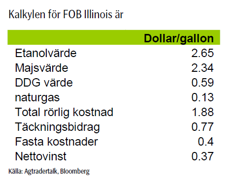 När det gäller etanol är det boom i USA. Firman Agtradertalk som sammanställer statistik visar följande nettovinst per gallon på att producera etanol, baserat på spotpriser FOB Illinois.