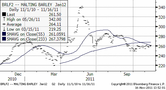 Maltkornsmarknaden följer vetet och det finns inga speciella nyheter att rapportera. Tekniskt ligger priset under glidande medelvärden. Den tekniska trenden är alltså nedåtriktad.