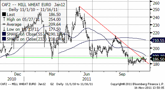Terminspriset på Matif-vete håller sig alltjämt över den psykologiskt viktiga 180-euro-nivån, men orosmolnen hopar sig. Ryssland och Ukrainas återinträde på världsmarknaden spelar en stor roll nu. Dessa exportländers volymer påverkar i synnerhet europeiska länders exportmarknad, som är Mellanöstern och Nordafrika. Särskilt märks detta för Frankrike, som är ett av världens största exportländer när det gäller vete. Frankrike har hittills på säsongen förlorat mer än ett dussin av Egyptens tenders; Egypten är världens viktigaste importland med ca 9 mt som årlig importvolym. Vete från Ryssland, Ukraina och Kazakstan väller ut över marknaden. Egypten har de senaste 17 gångerna valt vete från Svartahavsregionen. Exporten från Rouen, som är Europas största export-hub, noterade den 2 november fyra månaders lägsta nivå. Franska myndigheter räknar med 23% lägre export i perioden juli 2011 – juni 2012, jämfört med förra året. Det blir då den lägsta nivån på 10 år. Egypten har endast stått för 4% av Frankrikes export utanför EU sedan juli, mot 18% förra året.