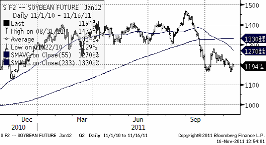 Priset på sojabönor befinner sig i sjunkande trend. Vi har redan sett de sjunkande priserna på fläskkött i Kina. Å andra sidan, China National Grain & Oils Information Center släppte en rapport i förrgår där de menar att Kinas import av sojabönor för marknadsföringsåret 2011-12 kan öka med 7% till 56 mt.