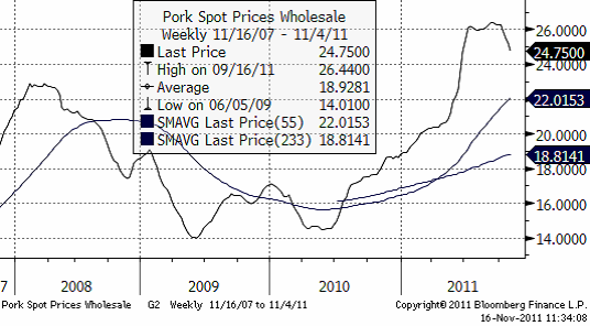 Det händer intressanta saker i bakgrunden till majsmarknaden. För det första handlar det om amerikansk etanolproduktion och för det andra om kinesisk fläskkonsumtion. Vi ser priserna i yuan per kilo (senast 24.75 yuan) i diagrammet nedan – notera det stora prisfallet som just pågår (två glidande medelvärden är också inritade):