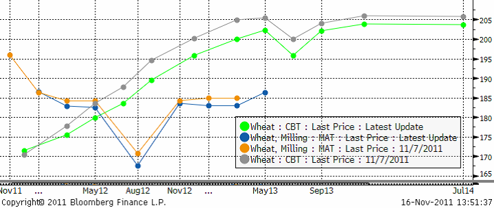 Nedan ser vi terminskurvan för Chicagovete och Matif nu och för en vecka sedan.