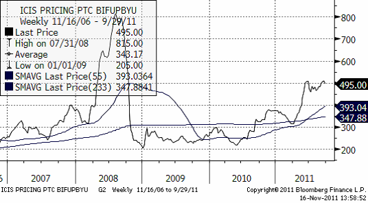 Nedan ser vi prisutvecklingen på Urea FOB Yuzhny i dollar per ton.