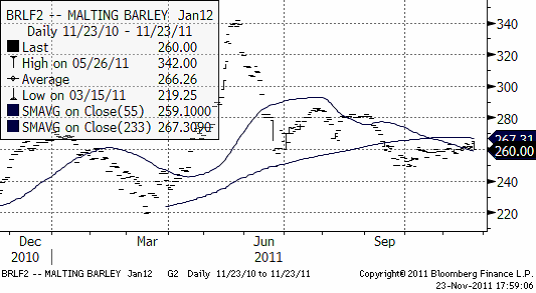 Maltkornsmarknaden följer vetet och det finns inga speciella nyheter att rapportera. Tekniskt ligger priset under glidande medelvärden. Den tekniska trenden är alltså nedåtriktad.