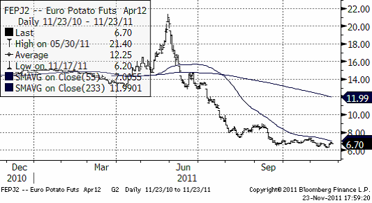 Nedan ser vi kursdiagrammet på europeisk potatis, som handlas på Eurex; terminen avser leverans april nästa år.
