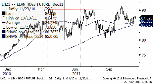 Tekniskt vilar priset på lean hogs på de glidande medelvärdena. Priset håller sig högt, trots svaghet i alla andra marknader utom ädelmetaller. Det är orimligt och priset på gris borde gå ner det också.
