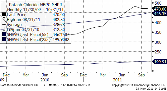 Priset på kalium ligger kvar på samma nivå som för ett par veckor sedan.