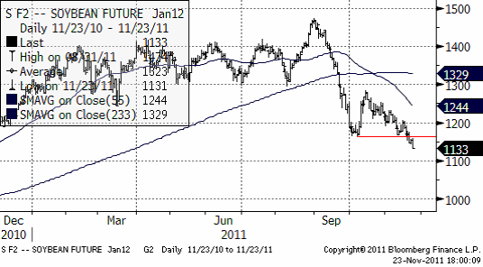 Priset på sojabönor befinner sig i en sjunkande trend. Det är en ”bear market”. Denna förstärktes för ett par dagar sedan när det tekniska stödet på 1167 bröts. Priset kan mycket väl gå ner mot 10 dollar.
