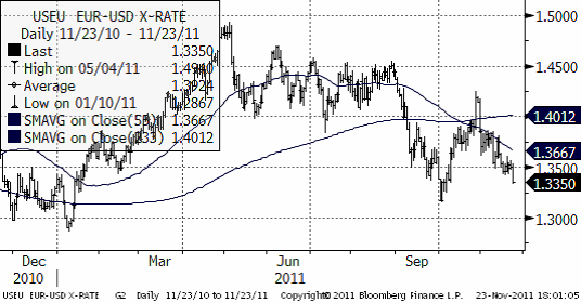 Europa ser inte bättre ut. Tyskland hade tänkt emittera nya obligationer igår, men mer än en tredjedel av dem blev kvar. Det berodde inte på att priset blev fel. Spararna var helt enkelt ointresserade. Under tiden ligger Italiens 10-årsränta kvar på samma höga nivå som före premiärministerbytet, Frankrikes ränta fortsätter stiga och Spaniens (”too big to save”) steg igår till 6.65%. Greklands ränta går inte att hitta längre i Bloomberg. ”Return on capital” är uppenbarligen ointressant. Det som visas är priset på statspapperen (lite drygt 20%), alltså ”return of capital”.