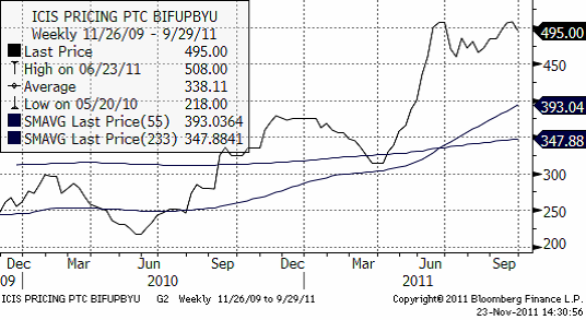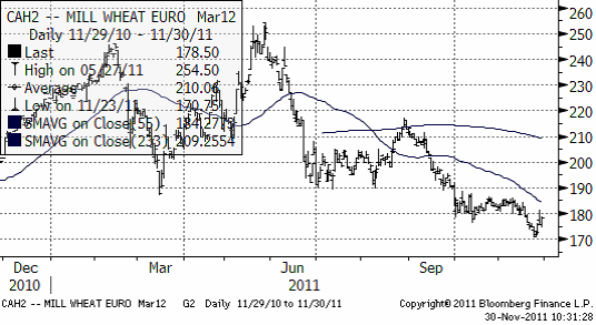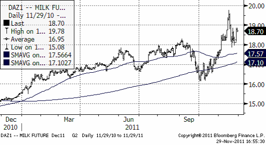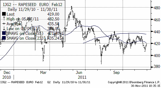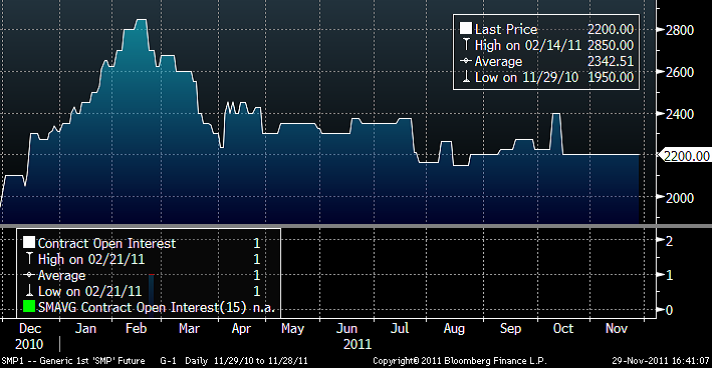 I diagrammet nedan ser vi decemberkontraktet 2011. Det avser priset nu i december och har därför ingen säsongsvariation som stör. Trenden är uppåtriktad och priset har stigit stadigt hittills i år, helt opåverkat av skuldkris.
