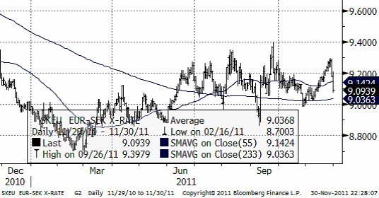 EURSEK handlas i ett brett intervall, utan trend vare sig uppåt eller nedåt.